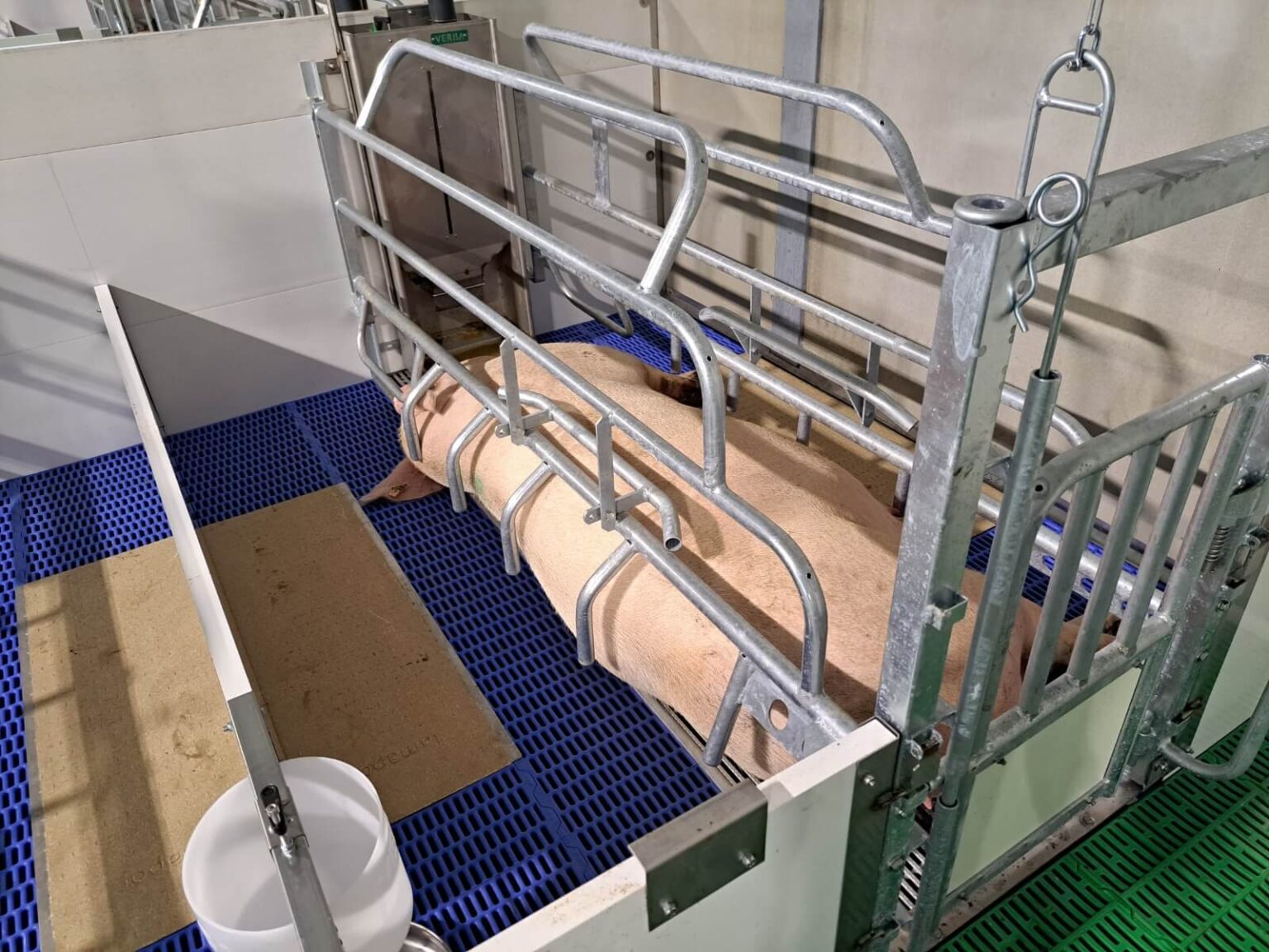Piglet nest located next to the sow’s head, promoting calmness for both sow and piglets.
